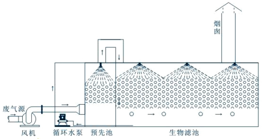 具體過程是:先將人工篩選的特種微生物菌群固定于填料上,當污染氣體經過填料表面時,微生物菌群從中獲得營養源,在適宜的溫度、濕度、pH值等條件下,能夠快速生長、繁殖,并在填料表面形成生物膜。在臭氣通過期間,有機物被生物膜表面的水層吸收后被微生物吸附和降解,得到凈化再生的水被重復使用。